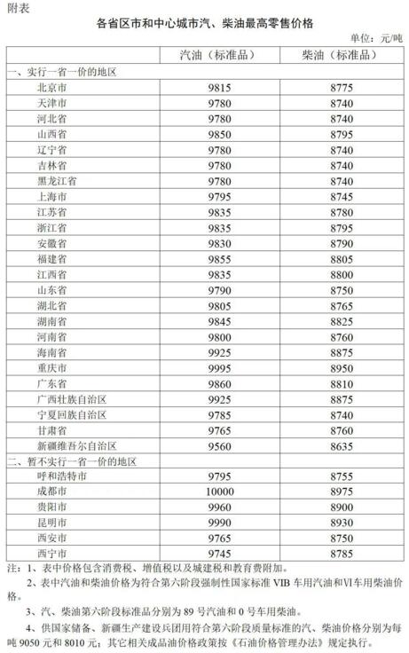 附:各省區(qū)市和中心城市汽、柴油最高零售價(jià)格