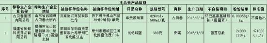 食藥監(jiān)總局表示,菌落總數(shù)超標說明個別企業(yè)可能未按要求嚴格控制生產(chǎn)加工過程的衛(wèi)生條件,或者包裝容器清洗消毒不到位;還有可能與產(chǎn)品包裝密封不嚴,儲運條件控制不當?shù)扔嘘P(guān)!∶麊芜顯示,1批次由山東省濟南財興商貿(mào)有限公司銷售,標稱古貝春集團有限公司生產(chǎn)的華貴貳號酒因檢出甜蜜素被通報。