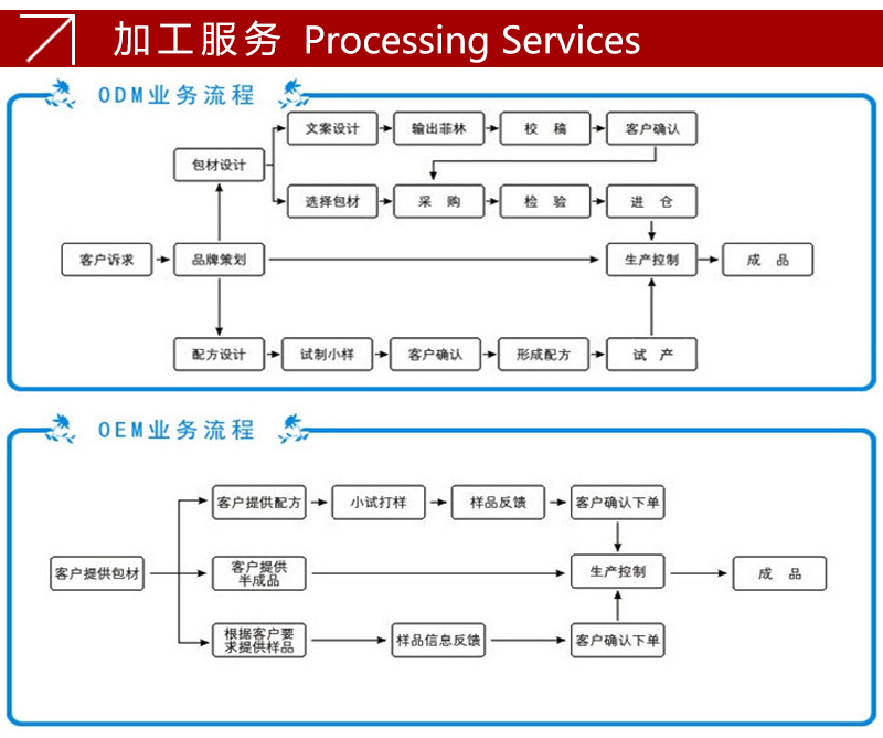 靈活代加工模式:包工包料、來料加工、配方定制、來樣開發(fā)、oem、odm