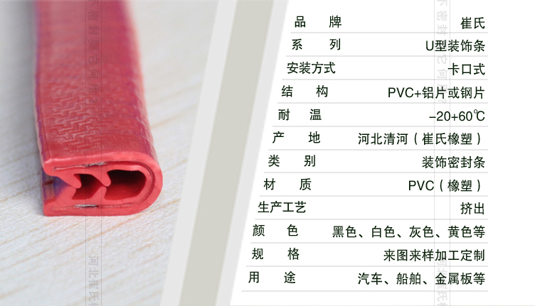 外涂層材料:vinyl(pvc) 硬度:85 durometer (shore a) 內(nèi)部金屬夾具材料:鋁或鋼 品牌崔氏類別汽車裝飾條截面形狀u型材質(zhì)pvc(橡塑)安裝方式卡口式生產(chǎn)工藝擠出結(jié)構(gòu)pvc+鋁片或鋼片顏色黑色、白色、灰色、黃色等耐溫-20+60℃規(guī)格來圖來樣加工定制產(chǎn)地河北清河(崔氏橡塑制品科技有限公司)用途船舶 貨車門 拖拉機(jī)駕駛室 電腦柜 鏟車 割草機(jī) 高爾夫推車 機(jī)械防護(hù)置 卡車駕駛艙 金屬板 玻璃纖維 頭盔 運(yùn)動(dòng)場(chǎng)器械