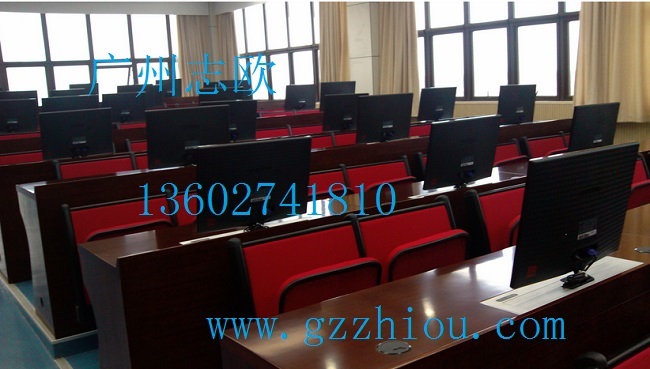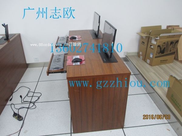 結(jié) 構(gòu):每張桌子配置2臺電動遙控液晶升降機(當時電腦時液晶顯示器自動重桌底升起且顯示器自動通電,當不使用顯示器時,顯示器自動隱藏于桌底),每一個位置都有一個電腦主機位,電腦桌前面設(shè)有檢修門,方便線路維修。