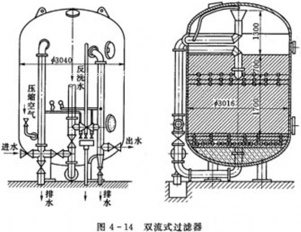 雙流式機(jī)械過(guò)濾器的濾料的進(jìn)水分為兩路,一路由濾料上部進(jìn)入,另一路由濾料下部進(jìn)入,過(guò)濾后的出水由中部排水裝置排出,中排裝置設(shè)在距濾料表面的70cm濾料層中。本過(guò)濾設(shè)備主要用于去除原水中的懸浮物、泥沙、鐵質(zhì)、錳和凝聚片狀物及用沉淀方法所不能去除的粘結(jié)膠質(zhì)顆粒等。
