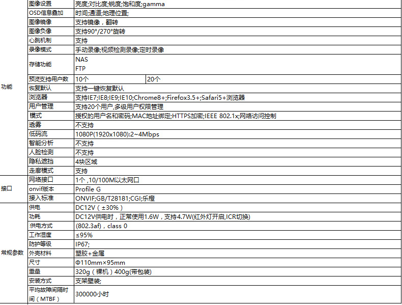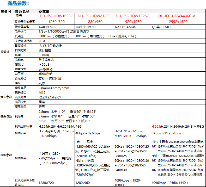 焦距: 2.8mm 3.6mm 6mm