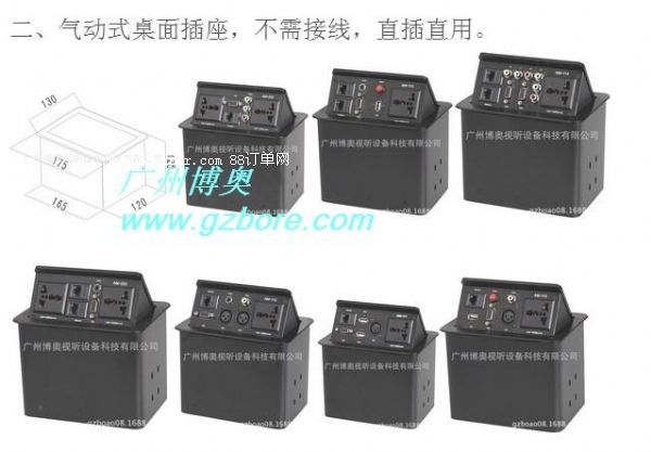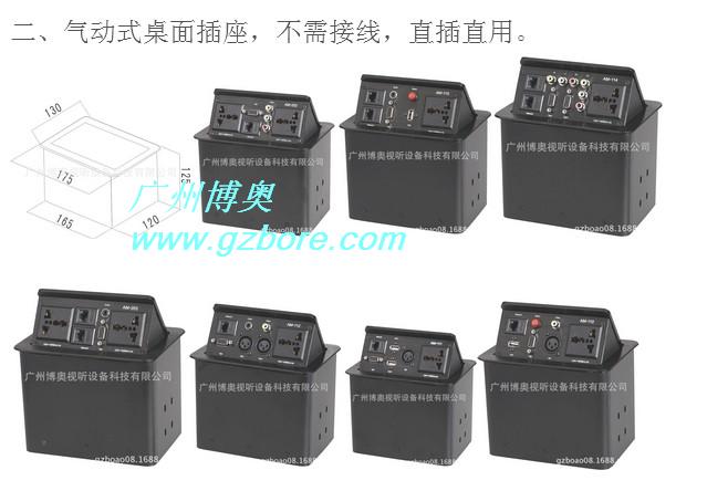 氣動式桌面插座為用戶提供了一個緊湊、美觀的桌面信號連接解決方案。它采用簡單易用的接入方式,我們在連接視頻、音頻、計算機視頻、網(wǎng)絡、電話、電源等接口時,輕按連接盒的頂部,連接盒即時釋放機械鎖定器,接口盒面被氣撐式結(jié)構平滑打開,完全展現(xiàn)出連接接口面。使用完畢后,只需輕輕按下接口盒蓋,機械鎖定器立即鎖定連接盒。鎖定后的連接盒與桌面保持齊平,所有接口被巧妙地隱藏起來,盒面美觀整潔并與桌面渾然一體。