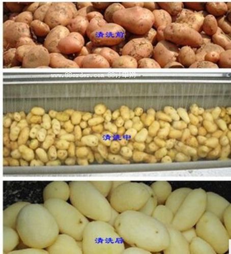 本機工作時,是將根莖類蔬菜或球類果品放置在幾根可滾動的毛刷輥上在組成的u型料斗里使物料與旋轉(zhuǎn)的毛刷輥接觸產(chǎn)生表面摩擦,清水從噴淋水管中噴出沖洗物料,從而達到洗凈的目的。