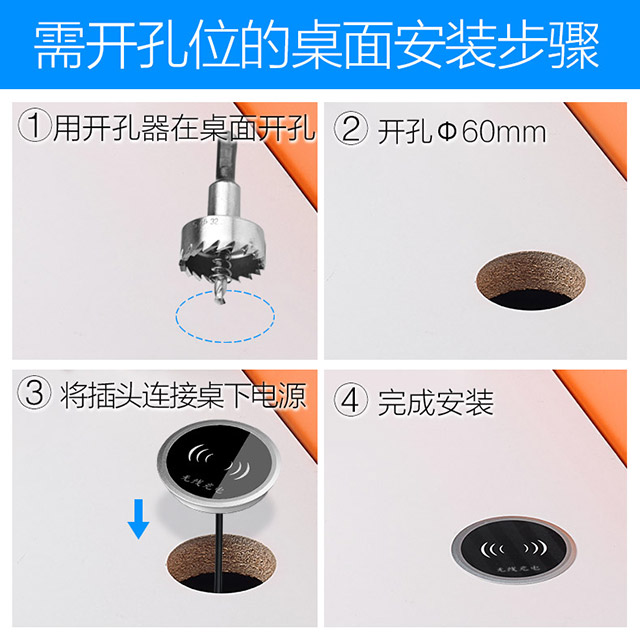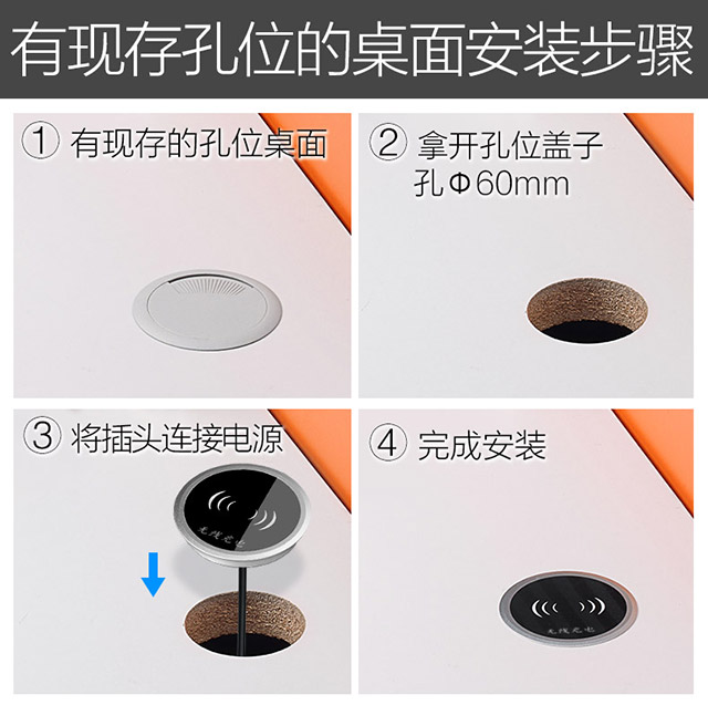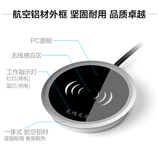 鑲嵌式桌面無(wú)線充電器,表面pc材質(zhì),防水,防刮花,底材合鋁合金成型,安全可靠。適合安裝在飯店,咖啡店,酒店等桌上,可以為商店帶來(lái)不可估量的增值。多種尺寸,可以定制。
