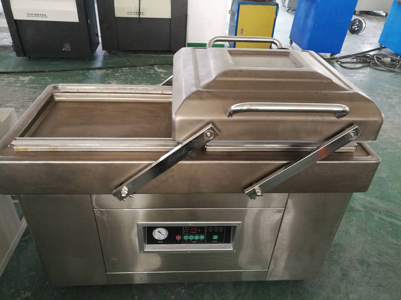 特性: 本機(jī)有兩個(gè)真空室輪番工作,上 、下工作室全部采用不銹鋼材料制成,結(jié)構(gòu)合理,氣密性好,美觀耐用,并符合食品衛(wèi)生與防腐的要求,上工作室裝有一組熱壓封口機(jī)裝置,并采用平衡結(jié)構(gòu),可改變?nèi)魏挝恢猛A,并有緩沖保護(hù)。封口溫度分四檔調(diào)節(jié),以改變發(fā)熱變壓器的高低來(lái)達(dá)到不同的封口溫度,熱封時(shí)間繼電壓器來(lái)控制,本機(jī)在封口的同時(shí)可以印上日期等字樣以符合國(guó)家食品標(biāo)簽法定規(guī)定。
