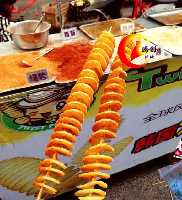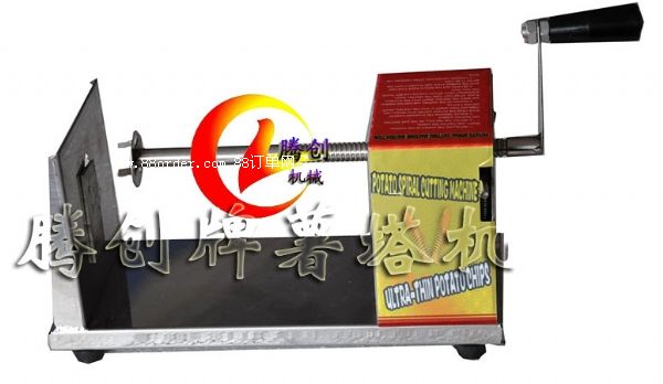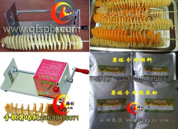 便攜式手搖薯塔機(jī),因其火爆的銷售場面和良好的市場反應(yīng),而別稱為黃金薯塔、旋風(fēng)薯塔,它是把整個(gè)土豆切成一串串螺旋金字塔狀的土豆串,穿在竹簽上尤其壯觀,再經(jīng)由專業(yè)薯塔制作工藝的油炸和調(diào)味,從而形成了現(xiàn)在市場上炙手可熱的黃金薯塔,不僅外形震撼,其中蘊(yùn)含的商機(jī)和利潤也讓人為之瘋狂!騰創(chuàng)手搖旋轉(zhuǎn)薯塔機(jī),專業(yè)為生產(chǎn)薯塔而設(shè)計(jì),是新熱門致富項(xiàng)目:1.機(jī)器款式新穎小巧、操作簡單,攜帶方便,不論是家庭聚餐還是做黃金薯塔生意都是好工具。用竹簽穿過土豆中心,把竹簽長端從刀架上孔往外穿出,竹簽未端插入轉(zhuǎn)軸內(nèi)孔,然后順時(shí)針轉(zhuǎn)動(dòng)手柄即可加工出精美的薯塔片。2.新升級(jí)款不銹鋼薯塔,整機(jī)采用加厚不銹鋼板,質(zhì)量保證,一年保修!3.薯塔機(jī)質(zhì)量升級(jí),固定土豆是四個(gè)叉,插土豆更牢固,且新款薯塔機(jī)特增刀片可拆裝功能,安置加厚磨砂刀片,切土豆不費(fèi)力,不易斷,減少浪費(fèi)損耗,降低制作成本。4.螺旋切土豆機(jī)一人就可以輕松操作,輕輕松松十幾秒就可以完成對(duì)一個(gè)土豆的旋切。每日狂切500-800串,穿在竹簽上呈螺旋金字塔、寶塔狀,外形震撼,吸引人。5.薯塔是采用新鮮土豆現(xiàn)削現(xiàn)炸而成,不含色素、各種添加劑,因?yàn)樾迈r,所以口感更為香、酥、脆!口感是一般薯?xiàng)l、薯片所不能比擬的,讓您生意火爆到不行,炸不夠賣的!現(xiàn)在購買贈(zèng)送刀片兩個(gè),贈(zèng)送制作薯塔技術(shù)光盤、說明書資料。此乃是升級(jí)款,質(zhì)量保證,一年保修,此款薯塔機(jī)切出薯塔片厚3mm左右,切出來不斷,炸出來不變形,口感更好,外形震撼!另外許多客戶反映找不到合適的油炸鍋來炸制薯塔,為方便廣大新老客戶,我公司專門生產(chǎn)設(shè)計(jì)了配套的炸薯塔油炸鍋。薯塔機(jī)、炸薯塔的油炸鍋、以及專業(yè)薯塔調(diào)料、炸粉等整套生產(chǎn)銷售!不用東奔西走,讓您一次配置齊全,馬上投入創(chuàng)業(yè)大軍!