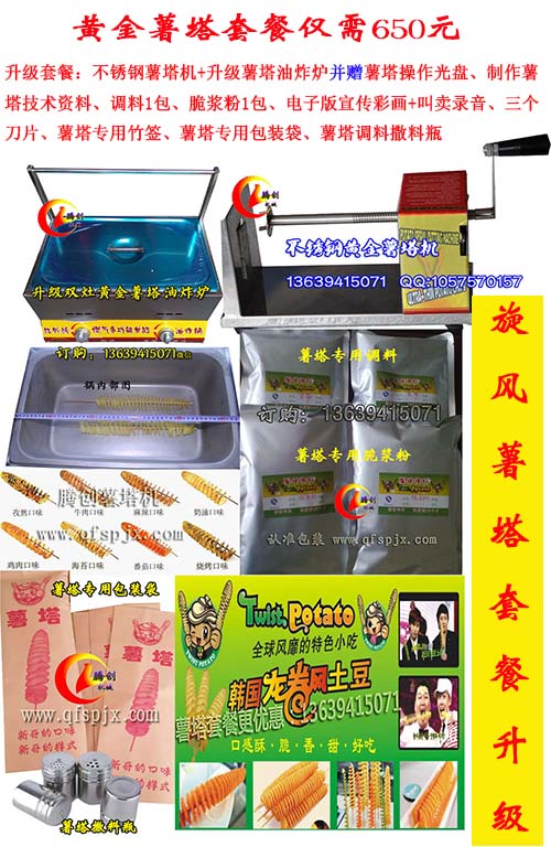 (豪華大禮包:薯塔操作光盤、制作薯塔技術(shù)資料、電子版宣傳彩畫+叫賣錄音、三個(gè)刀片、薯塔專用竹簽、薯塔專用包裝袋、薯塔調(diào)料撒料瓶、調(diào)料1包、脆漿粉1包 單買15元/包)特價(jià)680元(包郵)