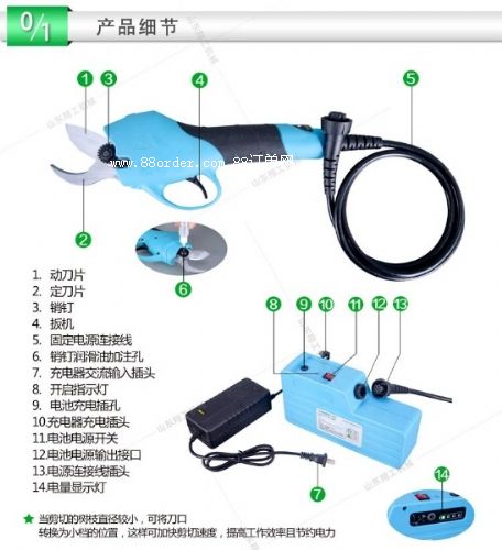 本產(chǎn)品為電池驅(qū)動電動修枝剪,由固定刀片、移動刀片、鋰電池、充電器、連接線、工作包、工具箱等部分組成,充電電壓為ac 110v~240v,主要應(yīng)用于30mm以下果枝嫁接的剪切和修剪及大批果園修剪、收摘等。使用時簡捷方便,可調(diào)整開口大小,是傳統(tǒng)手工剪枝效率的8-10倍,修枝質(zhì)量明顯高于傳統(tǒng)手工剪刀。