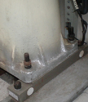 安裝與螺桿啟閉機(jī)的基座下,每一邊各裝置一只超載保護(hù)裝置,通過(guò)兩邊的固定螺絲分別于基座和底角相連接, 每臺(tái)螺桿啟閉機(jī)安裝兩只超載保護(hù)裝置(或一邊使用相同尺寸的鋼制件)。利用荷重傳感器正反受力的原理來(lái)實(shí)現(xiàn)螺桿機(jī)過(guò)載保護(hù):