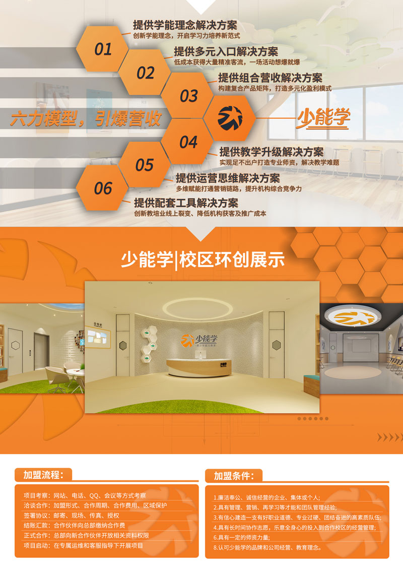 不一樣的素質(zhì)教育,我們專注于學(xué)能 學(xué)科有框架,教育無邊界!少能學(xué)是字強(qiáng)不息教育推出的專業(yè)創(chuàng)新的青少年學(xué)能教育品牌,專為小學(xué)段生源教育機(jī)構(gòu)提供學(xué)能類課程產(chǎn)品研發(fā)、實(shí)體辦學(xué)、品牌加盟等全系統(tǒng)解決方案。依托于卓越的專師研發(fā)團(tuán)隊(duì)和教育教學(xué)資源,少能學(xué)專注于培養(yǎng)5-12歲孩子的學(xué)習(xí)勝任力模型,開啟平衡左右腦的七大學(xué)習(xí)能力的大腦方程式。旨在從書寫力開始,全方位提升孩子的專注、閱讀、記憶、思維、理解、想象等能力,進(jìn)而全面激發(fā)和引爆孩子的學(xué)習(xí)力,助力其贏在自主學(xué)習(xí)革命新時(shí)代!
