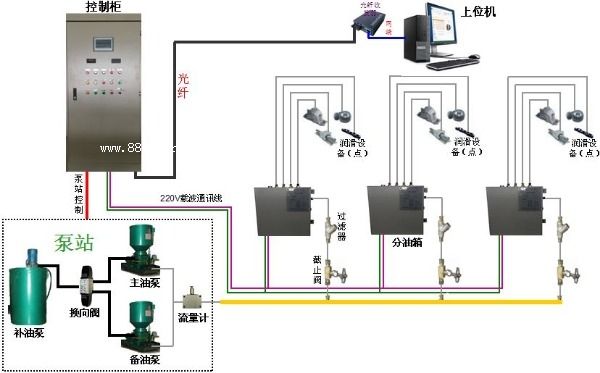4.主控柜具有與控制室或上位機(jī)連接的接口,接收控制室或上位機(jī)的控制、向控制室或上位機(jī)發(fā)送潤滑點(diǎn)供油信息