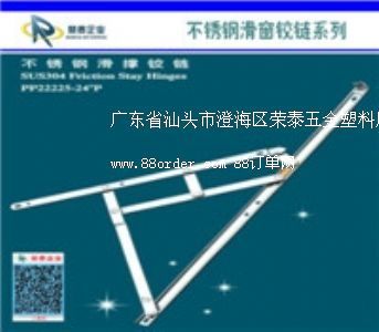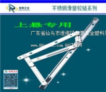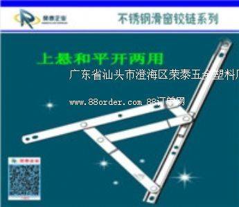 榮泰五金塑料廠成立于1990年,是國(guó)內(nèi)最早生產(chǎn)"不銹鋼滑撐鉸鏈"的廠家之一;是一家專門為國(guó)內(nèi)外建筑裝飾行業(yè)生產(chǎn)各種建筑五金制品的生產(chǎn)企業(yè);是"中國(guó)質(zhì)量、信譽(yù)、服務(wù)aaa級(jí)企業(yè)";所制造的"榮力斯"牌是(304材質(zhì)),"凱力斯"牌是(202材質(zhì)),"科創(chuàng)斯"牌是(201材質(zhì)),產(chǎn)品是"中國(guó)知名品牌"。不銹鋼滑撐鉸鏈(四連桿)有304不銹鋼材質(zhì),有202不銹鋼材質(zhì),有201不銹鋼材質(zhì),槽型有普通型槽和方型槽二款,品種有超重型系列、摩擦鉸鏈系列、幕墻限位鉸鏈等幾十個(gè)系列、上千個(gè)規(guī)格。槽寬型號(hào)有細(xì)槽(12mm、13.5mm、15mm)、窄槽(18mm)、中槽(20mm)、寬槽(22mm)、加寬(27mm)。從6寸----38寸等規(guī)格,適應(yīng)于各種不同的塑鋼型材和鋁合金型材配套使用。合頁(yè)(鉸鏈):從1寸至5寸各種規(guī)格,有方鉸、圓角、軸承、尼墊、抽心、定心、異型、旗型等款式,長(zhǎng)排合頁(yè)有優(yōu)質(zhì)全304不銹鋼長(zhǎng)排鋼琴合頁(yè),寬度1至3寸×1800mm, 厚度0.8mm. 至1.5mm等規(guī)格。產(chǎn)品以其質(zhì)量高、價(jià)格低、服務(wù)優(yōu)贏得了廣大用戶的信賴和好評(píng)。歡迎新老客戶前來(lái)洽談合作,您的滿意就是我們的追求。我廠技術(shù)部可以按照客戶的要求進(jìn)行生產(chǎn), 我們?cè)敢鉃槟ǹ蛻簦┨峁┩晟频氖矍白稍,售后服?wù)及技術(shù)支持,保證您滿意的服務(wù)和高質(zhì)量的采購(gòu)。
