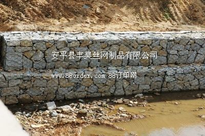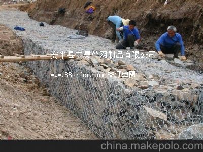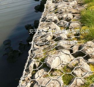 金屬線材編織的角形網(wǎng)(六角網(wǎng))制成的網(wǎng)箱 箱型石籠由大規(guī)格六角網(wǎng)聯(lián)結(jié)而成,施工中只需將石塊裝入籠中封口即可 |