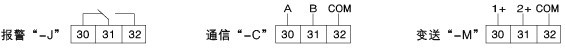 注1:儀表端子30、31、32為輔助功能輸出端:故障報(bào)警“-j”、通信“-c”、變送“-m”。