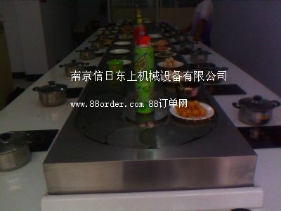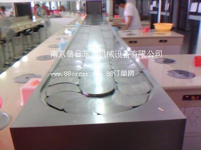輸送帶設備 壽司輸送帶 火鍋輸送帶是信日東上機械設備有限公司生產(chǎn)的酒店配套設備。生產(chǎn)的主要產(chǎn)品有:回轉壽司、壽司輸送帶、回轉壽司線、回轉壽司輸送帶、回轉火鍋傳送帶、壽司設備、回轉壽司設備、壽司線、壽司輸送線、壽司回轉輸送帶、壽司輸送設備、旋轉壽司設備、旋轉壽司輸送帶、壽司臺、旋轉壽司、壽司機械、回轉火鍋、回轉火鍋設備、回轉火鍋輸送帶、旋轉火鍋、回轉火鍋傳送帶等。壽司設備,壽司輸送帶,自助旋轉火鍋線是餐飲創(chuàng)業(yè)首選設備。不需要設大廚房,整個配制、加工過程,都由顧客在餐桌上自己完成,節(jié)省空間是其一優(yōu)點; 不需要大型灶臺和灶具,無需大廚,普通服務員無需培訓就能操作,簡單易操作是其優(yōu)點之二; 回轉火鍋是一人一鍋,即可根據(jù)顧客喜愛選擇各色菜品又符合個人衛(wèi)生習慣,綠色飲食回歸自然是其優(yōu)點之三;獨特新穎的回轉火鍋設備工藝,配用現(xiàn)代高科技電磁爐具,沒有明火,不存在安全隱患,沒有絲毫油煙產(chǎn)生,環(huán)保、衛(wèi)生是其優(yōu)點之四;剞D火鍋設備均由以下部分構成:臺架系統(tǒng)、動力系統(tǒng)、輸送鏈系統(tǒng) 、軌道系統(tǒng)。 我司的回轉輸送設備采用進口電器元件、鏈片及導軌均采用304不銹鋼材質,配合不銹鋼鏡面板或不銹鋼拉絲面板,外觀整潔、美觀。