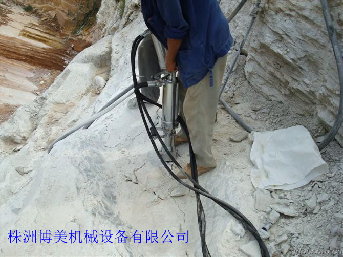 花崗石礦山的開(kāi)采:花崗石礦山機(jī)械化開(kāi)采難度相對(duì)較大。近幾年主要以株洲市博美機(jī)械有限公司生產(chǎn)的液壓分裂機(jī)開(kāi)采為主,進(jìn)行花崗石的開(kāi)采,此種設(shè)備主要由泵站和分裂器兩大部分組成,由泵站輸出的高壓油,驅(qū)動(dòng)油缸,產(chǎn)生巨大推力,驅(qū)動(dòng)楔塊組中的中間楔塊向前駛出,將反向楔塊向兩邊撐開(kāi)。