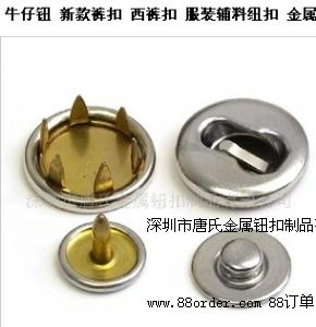 唐氏金屬鈕扣廠是一家品牌老廠,從最早2002年成立至今,在五金鈕扣領(lǐng)域經(jīng)歷了十多年年的摸打滾爬,歷經(jīng)無數(shù)風(fēng)風(fēng)雨雨,但唐氏人從來沒有改變過對(duì)品質(zhì)的執(zhí)著!唐氏ts品牌五爪扣,選料上乘,做工精細(xì),款式繁多,質(zhì)優(yōu)價(jià)廉! 本廠專業(yè)生產(chǎn)各種五爪扣,如:銅五爪扣/珠光面五爪扣/刻字五爪扣/刻花五爪扣/帶鉆五爪扣/空心五爪扣/噴漆五爪扣/電鍍五爪扣/平面五爪扣/平面空心五爪扣/7.5mm/9.5mm/11mm/13mm/15mm/17mm/20mm/21mm等等60多個(gè)款式供客戶選擇,應(yīng)有盡有。 唐氏金屬鈕扣廠家六大產(chǎn)品詳細(xì): 1.四合扣:60個(gè)款式金屬四合扣,急鈕,按扣,手鐲專用扣,首飾扣面.手環(huán)裝飾按鈕. 2.五爪鈕:111#-999.5# 80多個(gè)規(guī)格圈面爪鈕,加長(zhǎng)爪托,霖面/包面爪鈕;珠面爪鈕. 3.啪鈕:20個(gè)款式滴膠啪鈕,四方啪鈕,飛碟款啪鈕,歐美款啪鈕,車輪款啪鈕. 4.時(shí)裝鈕:30個(gè)款式皇宮款時(shí)裝鈕,蘑菇型時(shí)裝鈕,球形時(shí)裝鈕,噴油/鍍金色時(shí)裝鈕. 5.水泡鈕:10個(gè)款式恭候客戶選擇,各種鈕面應(yīng)有盡有,各種力度任客選擇. 6.西褲扣:70個(gè)款式西褲扣,包面褲扣,勾扣,電鍍褲扣,鍍金色西褲扣,噴油褲前扣