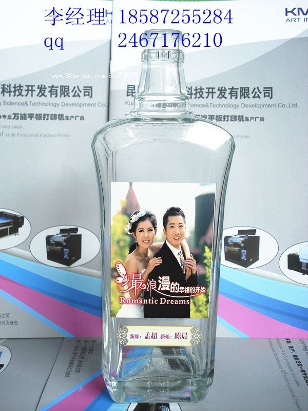以上的吉祥語言博易創(chuàng)萬能打印機真正能實現(xiàn)在酒瓶上.只需把您需要打印的圖片、文字、logo在電腦里設(shè)計好,把要打印的酒瓶放到打印平臺的圓柱體工裝上,直接點打印,您想要的效果就能呈現(xiàn)在酒瓶上.打印效果鮮艷、清晰、牢固,酒瓶美觀、大方,不僅具有獨特的個性效果,還具有珍藏價值.詳細情況請到昆明博易創(chuàng)科技開發(fā)有限公司來咨詢.