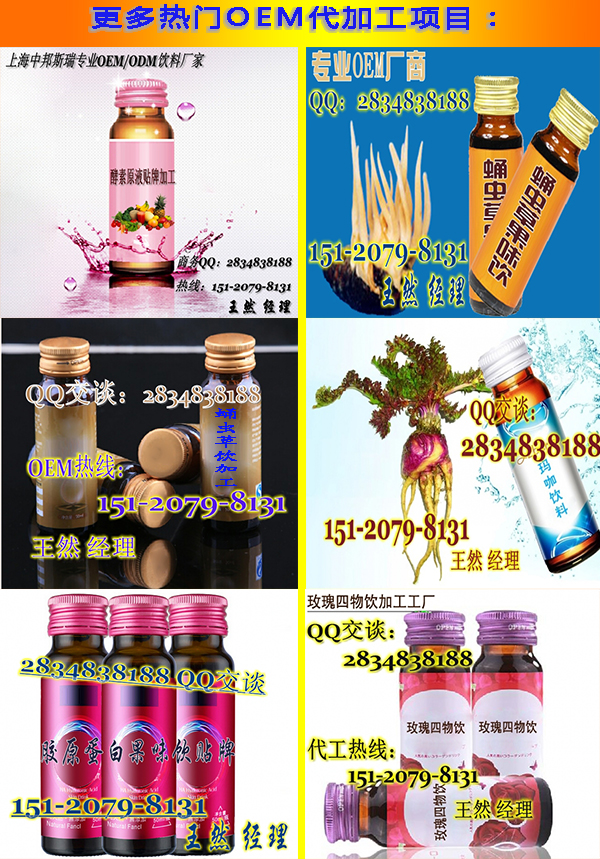 —本公司專業(yè)提供oem貼牌加工:藍(lán)莓酵素飲料oem,果蔬酵素oem,蔓越莓果汁飲料加工,膠原蛋白飲料加工,膠原蛋白飲料加工,諾麗果味膠原蛋白飲料oem,膠原蛋白飲料貼牌,膠原蛋白飲料加工,瑪咖飲加工,蛹蟲草飲加工,人參飲oem加工,沙棘果飲代加工,50ml植物酵素飲加工,玫瑰四物飲加工,多莓葡萄籽果汁加工,蔬果酵素飲料貼牌,酵素oem,酵素加工,酵素貼牌,酵素飲料加工,酵素飲料加工,優(yōu)質(zhì)酵素飲料貼牌,優(yōu)質(zhì)酵素加工,蔓越莓果汁飲料加工,馥莓飲oem,馥莓飲料加工,專業(yè)提供質(zhì)量效果好,價格低的口服飲料、膠原蛋白產(chǎn)品加工。