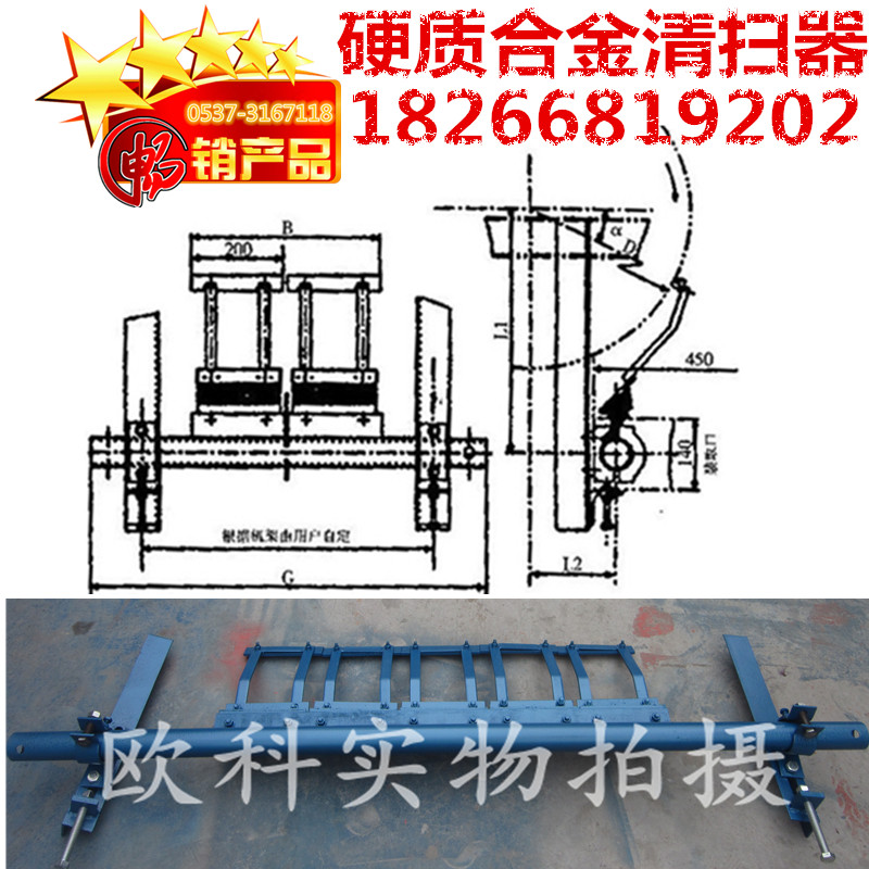 n型硬質(zhì)合金清掃器安裝于頭部滾筒附近平穩(wěn)工作面處,清除可逆運(yùn)行輸送帶上的粘附物料。