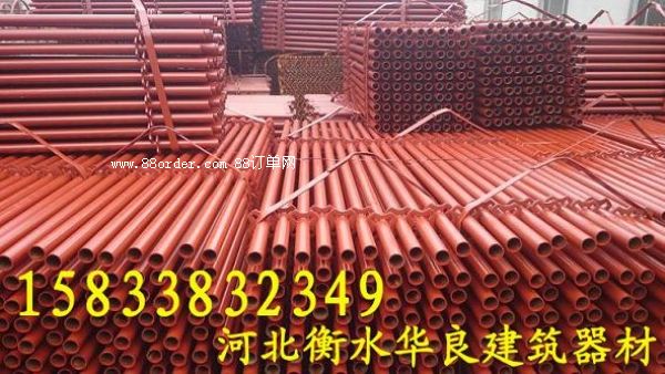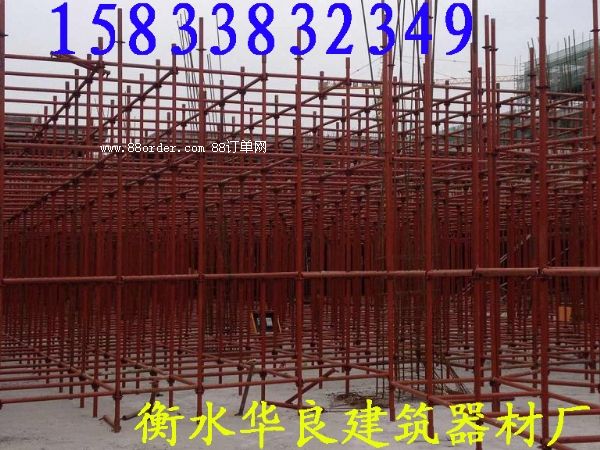 河北衡水華良建筑器材聯(lián)系電話:158-3383-2349 ,輪扣腳手架、碗扣腳手架、快拆式腳手架、承插式新型腳手架、直插式腳手架、鋼管腳手架、建筑腳手架,新型建筑支撐,腳手架,模板支撐,新型模板支撐, 新型建筑支撐。這種新型材料的特點(diǎn)是:耐腐蝕,彈性大,堅(jiān)固不變形。易搭拆腳手架,施工速度快的腳手架。 每根支撐桿可以支撐3-4噸左右,兩根主龍脊之間可以承重2-2.5噸的重量,每根副龍脊可以承重1噸,F(xiàn)在工地現(xiàn)澆水泥一般厚度也就是10-15厘米,同等面積重量最多100-150公斤,所以這個(gè)支撐力度一般高層建筑完全夠用。