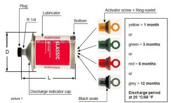 perma classic自動(dòng)注油器適用于環(huán)境溫度在0~+40oc之間的各種工況,基于電化學(xué)反應(yīng)的工作原理保證潤(rùn)滑系統(tǒng)可靠運(yùn)行。頂端的激活扣按照潤(rùn)滑周期的不同使用不同顏色區(qū)分,用戶可以根據(jù)需要將120cm3容量的潤(rùn)滑劑設(shè)定成1、3、6或12個(gè)月的潤(rùn)滑周期。電化學(xué)反應(yīng)產(chǎn)生的罐體內(nèi)部氣壓(最大可達(dá)4bar)推動(dòng)活塞向前,持續(xù)將少量潤(rùn)滑劑擠出至潤(rùn)滑點(diǎn)。perma classic 完全防塵防水并且可以承受意外跌落和撞擊。