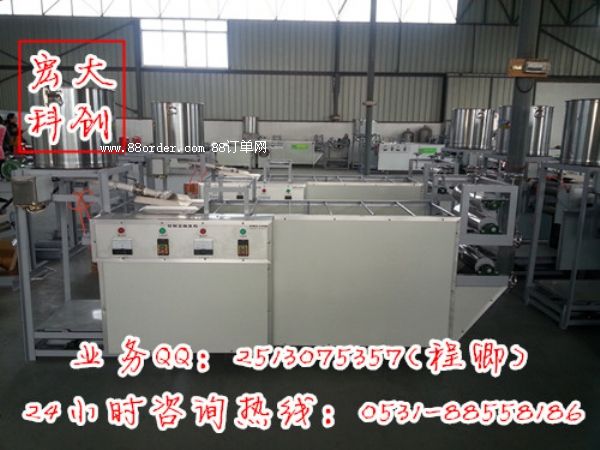 宏大科創(chuàng)豆腐皮機(jī)器采用全自動、全封閉、蒸汽供熱一條龍生產(chǎn),其制成品具有外觀平整、色澤淡黃、鮮艷晶亮、保質(zhì)期長、口感軟筋、易運(yùn)輸?shù)忍攸c(diǎn)。經(jīng)過多年研究,制造出豆腐皮機(jī)組,使豆腐皮生產(chǎn)進(jìn)入工業(yè)化階段。我們的自動豆腐皮機(jī)生產(chǎn)效率高、成本低、寬窄自調(diào)、省時省力;所產(chǎn)產(chǎn)品色澤鮮亮、口感良好、市場口碑好。自動豆腐皮機(jī)(百葉機(jī)、豆腐皮機(jī)、豆腐皮機(jī))生產(chǎn)出來的各種產(chǎn)品,采用獨(dú)特配方可生產(chǎn)五香味、魚味、雞味、麻辣味、孜然味、三鮮味等多種風(fēng)味的豆腐絲、豆腐卷、豆腐干等的風(fēng)味食品。該機(jī)結(jié)構(gòu)緊湊、性能穩(wěn)定、工藝先進(jìn)、操作方便。是實(shí)現(xiàn)大豆深加工轉(zhuǎn)化為經(jīng)濟(jì)優(yōu)勢的理想機(jī)之一。如果您有什么想要詳細(xì)咨詢了解的可以加我們的在線客服qq:2513075357或者打我們下方的咨詢電話:0531-88558186或13075303743與我們聯(lián)系。歡迎廣大客戶來宏大科創(chuàng)參觀學(xué)習(xí)!