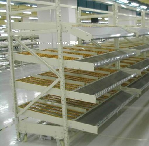 行運(yùn)送,人工存取,存取方便,單元貨架每層載重量通常在1000kg左右,貨架高度在2.5米以內(nèi)。適于裝配線兩側(cè)的工序轉(zhuǎn)換、配送中心的揀選作業(yè)等場所,可配以電子標(biāo)簽實(shí)現(xiàn)貨物的信息