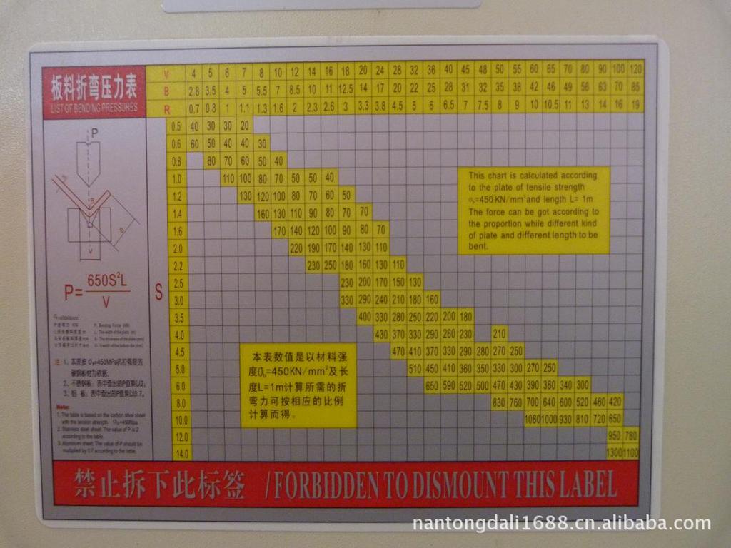 上圖圖示為:折彎?rùn)C(jī)壓力計(jì)算表