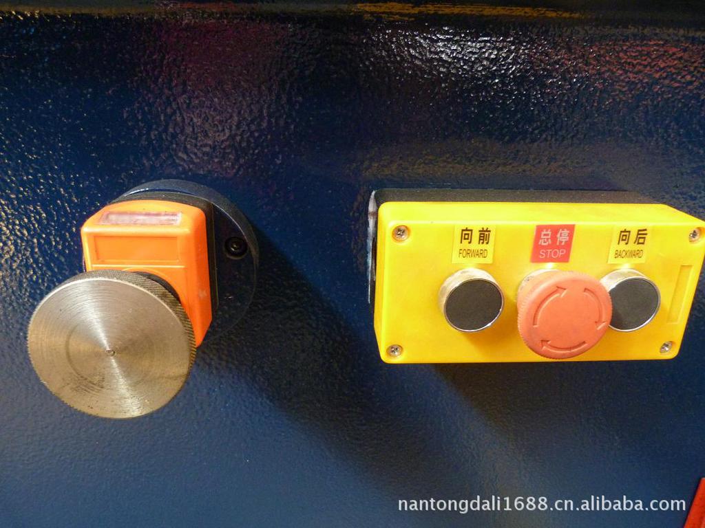 上圖圖示為:后檔料電動(dòng)調(diào)節(jié)開關(guān)、手動(dòng)微調(diào)裝置。通過電動(dòng)控制后擋料來實(shí)現(xiàn)后定位,方便、快捷、準(zhǔn)確,增加工作效率。