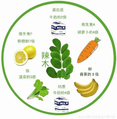 辣木葉片、果莢富含多種礦物質、維生素、20種氨基酸、46種抗氧素、36種自然防炎體和礦物質。每100克的辣木中含有的維生素c是柑橘的7倍,鐵是菠菜的3倍,維生素a是胡蘿卜的4倍,鈣質是牛奶的4倍,鉀是香蕉的3倍,蛋白質是酸奶的2倍。