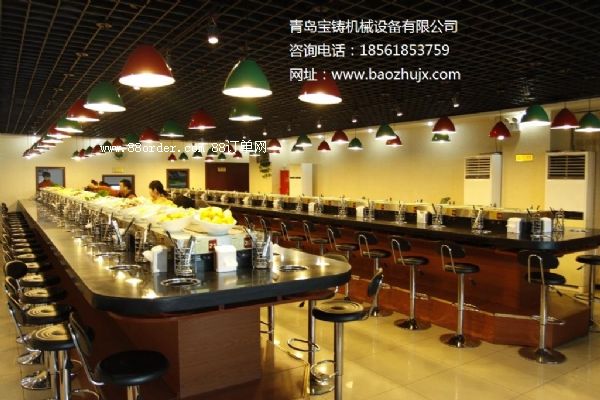 該設(shè)備啟動(dòng)后,輸送帶會(huì)自動(dòng)回轉(zhuǎn),廚師將制作好的食品用碟子裝好放置在輸送帶上面,食品就會(huì)隨輸送帶循環(huán)回轉(zhuǎn),送到在座的每一位客人面前,供客人隨意選擇食用。并隨時(shí)給予補(bǔ)充食品,形成下一個(gè)循環(huán)。