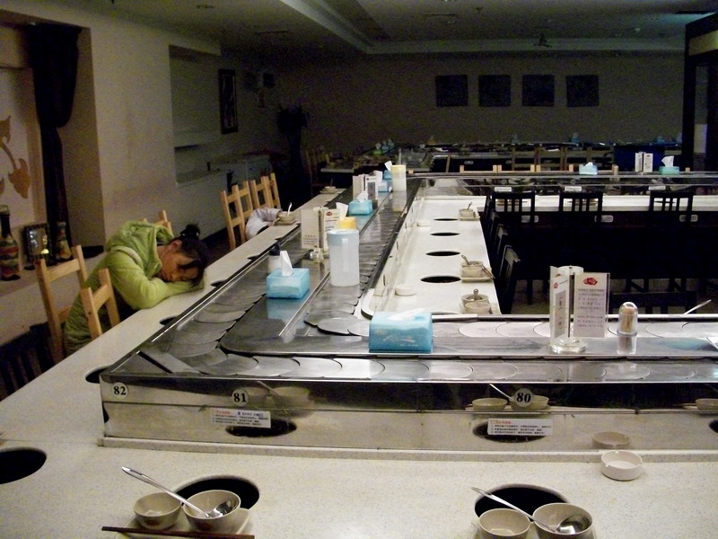 然后輸送帶就會(huì)帶著食材圍繞店鋪的座位循環(huán)回轉(zhuǎn)。工作人員站在原地就可以隨時(shí)補(bǔ)充新鮮的食材,而不用到處跑動(dòng),最大限度的減縮了人力資源成本的損耗。而消費(fèi)者也不用再看哪些枯燥無味的菜單,