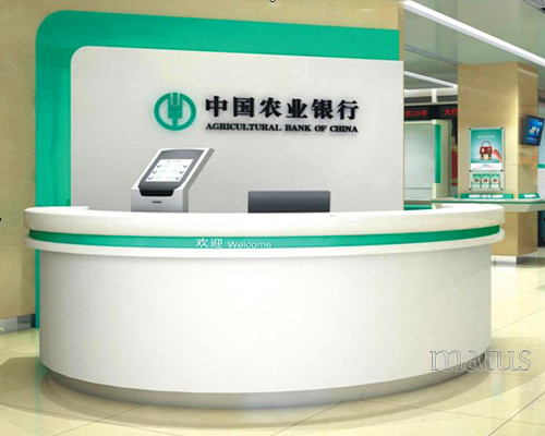 材質(zhì):白色人造石臺面,配農(nóng)行綠色亞克力裝飾邊,白色烤漆臺身,淺灰色免漆板內(nèi)鋪臺,拉絲不銹鋼底座