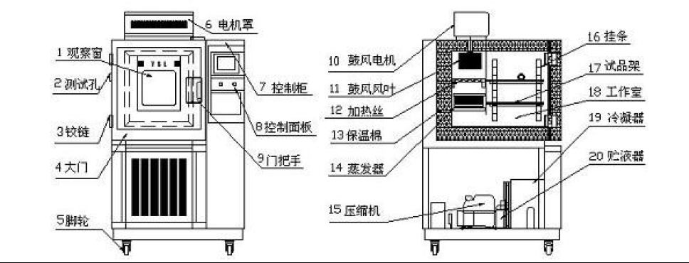 8、觀察窗采用多層中空鋼化玻璃,內(nèi)側(cè)膠合片式導電膜加熱除霜(清楚觀察試驗過程);