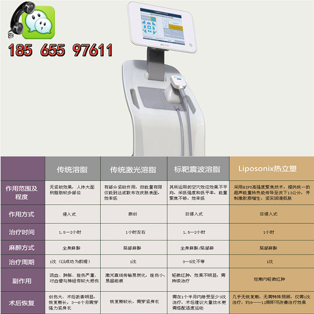 熱立塑.高能聚焦超聲波(hifu)永久破壞脂肪,減少脂肪細胞數(shù)量; 2.智能掃描系統(tǒng),鎖定皮下1.3公分的脂肪,不對表皮造成任何傷害; 3.術(shù)后無傷口,熱能促進膠原增生,術(shù)后肌膚緊致有彈性,無需穿塑身衣。