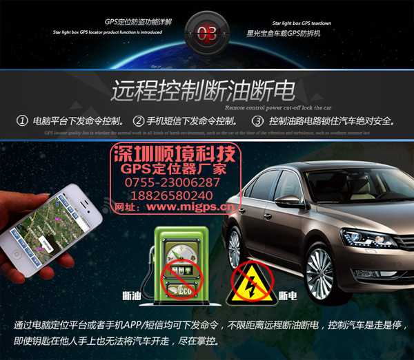 1、防盜:實(shí)時(shí)定位,電腦控制斷油斷電功能、手機(jī)發(fā)短信控制功能雙向通道,車輛油電路控制在自己手里。