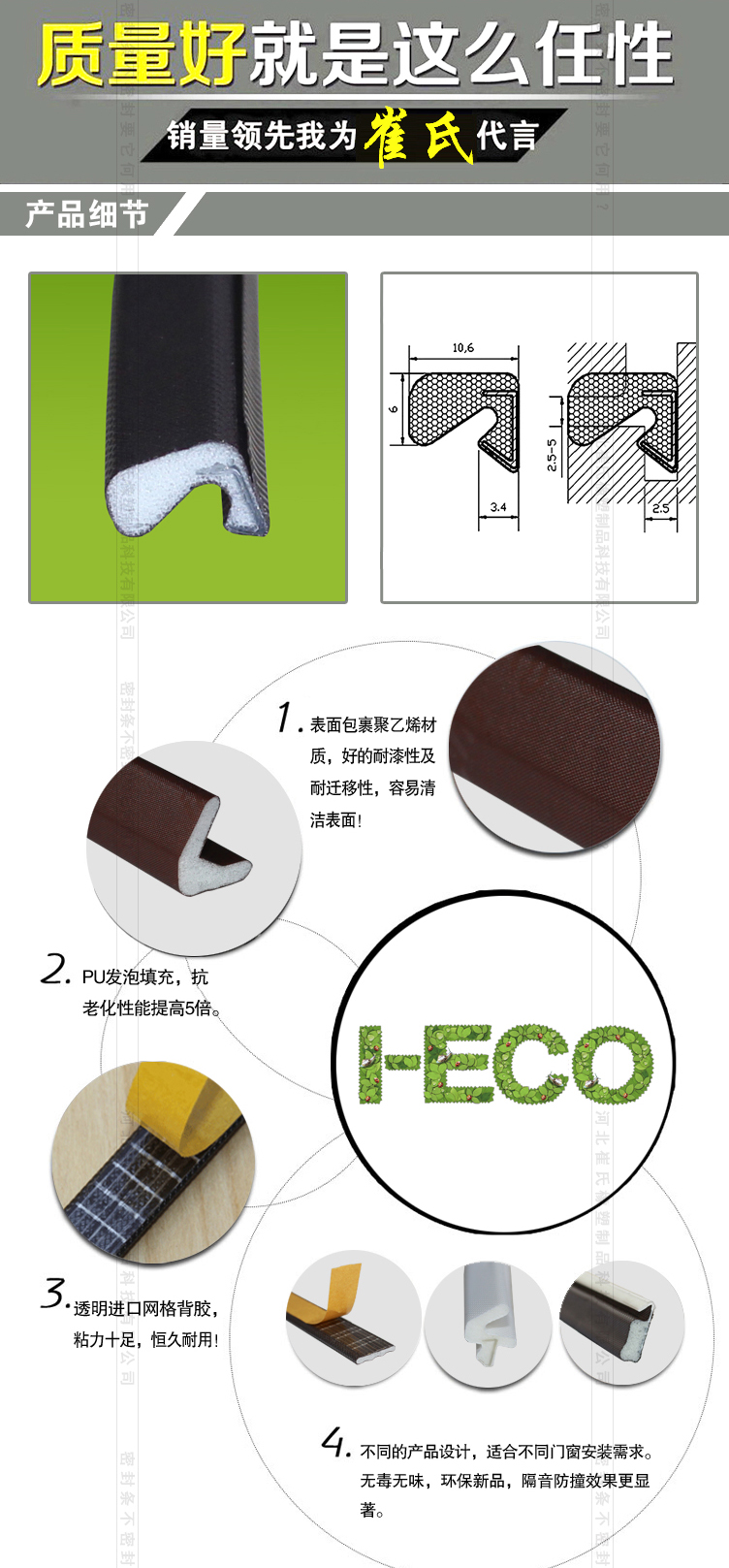 隔熱防寒,防風塵及爬蟲,外觀高檔,耐老化 防紫外線 防水不變形 產(chǎn)品質(zhì)保10年 深得國內(nèi)高端門窗廠家認可,是目前國內(nèi)最高端的新一代門窗密封條產(chǎn)品