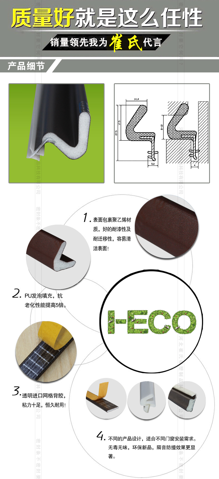 包覆式密封條在耐老化、耐疲勞、壓縮變形測(cè)試、壓縮力測(cè)試、熱傳導(dǎo)k值測(cè)試、水侵性、水滲透性等測(cè)試中均取得超越所有傳統(tǒng)產(chǎn)品的優(yōu)秀的結(jié)果;同時(shí)包覆式密封條節(jié)能環(huán)保、隔音降噪、抗強(qiáng)紫外線(xiàn),無(wú)毒、不與任何油漆、清潔劑發(fā)生反應(yīng),迎合新時(shí)代綠色健康主題。