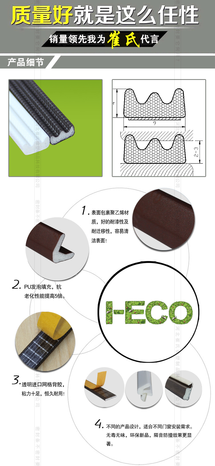包覆式密封條在耐老化、耐疲勞、壓縮變形測(cè)試、壓縮力測(cè)試、熱傳導(dǎo)k值測(cè)試、水侵性、水滲透性等測(cè)試中均取得超越所有傳統(tǒng)產(chǎn)品的優(yōu)秀的結(jié)果;同時(shí)包覆式密封條節(jié)能環(huán)保、隔音降噪、抗強(qiáng)紫外線,無毒、不與任何油漆、清潔劑發(fā)生反應(yīng),迎合新時(shí)代綠色健康主題。
