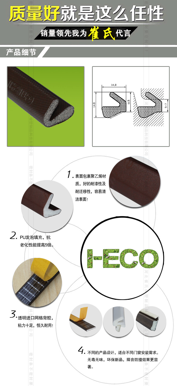 包覆式密封條在耐老化、耐疲勞、壓縮變形測試、壓縮力測試、熱傳導(dǎo)k值測試、水侵性、水滲透性等測試中均取得超越所有傳統(tǒng)產(chǎn)品的優(yōu)秀的結(jié)果;同時包覆式密封條節(jié)能環(huán)保、隔音降噪、抗強紫外線,無毒、不與任何油漆、清潔劑發(fā)生反應(yīng),迎合新時代綠色健康主題。