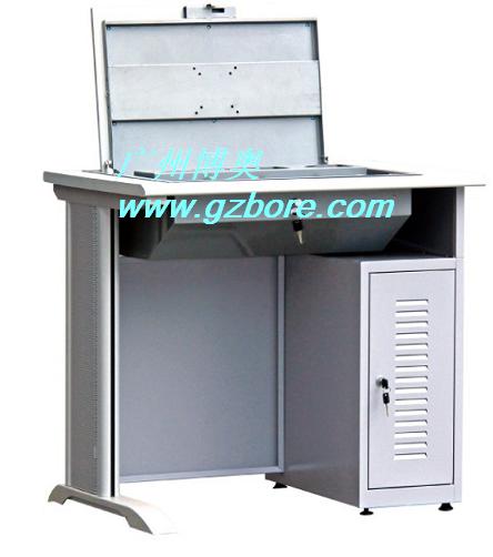 結(jié) 構(gòu):使用時只要打開鎖,液晶顯示屏便會自動翻起,鍵盤也同時自動打開。當(dāng)不使用時,可用手動按下翻蓋面板。整個翻轉(zhuǎn)器與桌面齊平,產(chǎn)品具有防塵保持桌面平整,美化桌面等功能。電腦主機位置有鎖上,可防盜,