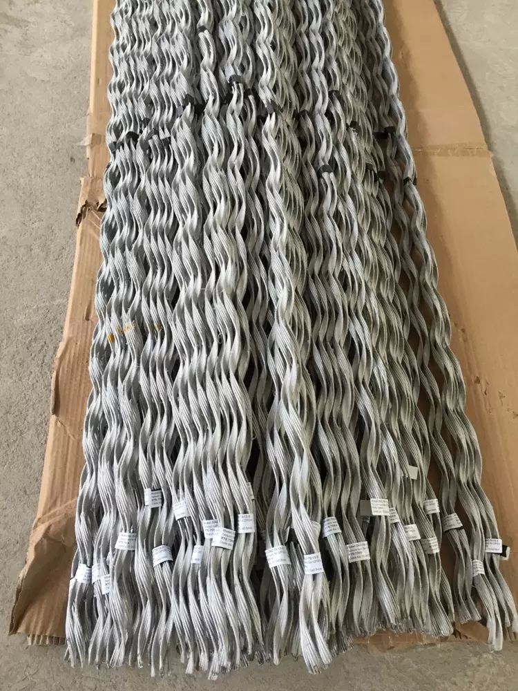 (1)安裝內(nèi)絞絲之前,將外絞絲穿過耐張嵌環(huán)并使之與光纜平行。(2)根據(jù)外絞絲上的絞合標記在光纜的響應(yīng)位置處做安裝標記,此標記作為安裝內(nèi)絞絲的參照點。(3)將內(nèi)絞絲帶有絞合標記的一端靠近桿塔,并使內(nèi)絞絲上的絞合標記與步驟(1)中所作光纜上的安裝標記對準。(4)將第一組內(nèi)絞絲纏繞在光纜上。為了便于安裝,可以將絞絲的末端留下一部分不纏繞。(5)將第二組內(nèi)絞絲的中心標記與第一組內(nèi)絞絲的中心標記對準。(6)將第二組內(nèi)絞絲沿中心標記向光纜兩端各纏繞約2-3個導(dǎo)程,保持末端松弛。(7)重復(fù)步驟5/6,將剩余的內(nèi)絞絲纏繞光纜上。注意:為避免剩余絞絲安裝困難的現(xiàn)象,應(yīng)使纏繞的每組內(nèi)絞絲間盡量靠近。沿內(nèi)絞絲中心標記向兩端各纏繞2-3個導(dǎo)程的做法也將有助于避免絞絲安裝的現(xiàn)象。(8)在不使用任何工具的情況下,將內(nèi)絞絲的一端依次纏繞到位后再纏繞另外一端。為了保證內(nèi)絞絲的加強效果,務(wù)必在纏繞時使絞絲不要交叉,且所有的絞絲排列均勻,并與光纜保持良好的貼合效果。(9)將外絞絲穿過耐張嵌環(huán),使外絞絲的絞合標記與內(nèi)絞絲上的絞合標記對準。(10)自內(nèi)外絞絲交合位置處開始纏繞外絞絲?梢赃x擇先纏繞一條腿,再纏繞另一條腿的方法。但是,兩條腿同時纏繞的方法將有利于安裝。(11)為了方便最后安裝,可以將兩條腿的最后安裝,可以將兩條腿的最后兩個節(jié)距上的外絞絲一一分開纏繞,以保證所有的線條都扣緊到位。(12)將au型環(huán)。ph型延長環(huán)等連接金具安裝到位,穿好螺栓并緊固好螺母,墊圈等標準件,插上放松開口銷。(13)將耐張線夾固定在桿塔緊固金具上 c.在不超過adss光纜側(cè)壓強度的前提下,對光纜有較大的握著力,能承受較大的張力。