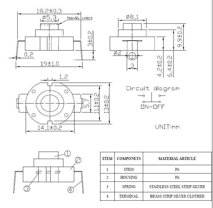 產(chǎn)品名稱:按鈕開關(guān) 圓形 采購(gòu)量:10000000pcs 產(chǎn)品描述:rohs pbs-20c 14*13總高:9.9mm柄高:3.5mm動(dòng)作力:8±2n 壽命不小3萬
