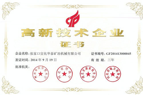 張家口宣化華泰礦冶機(jī)械有限公司在2011年通過(guò)“河北省認(rèn)定機(jī)構(gòu)辦公室”審核,被河北省科學(xué)技術(shù)廳、河北省財(cái)政廳、河北省國(guó)家稅務(wù)局、河北省地方稅務(wù)局認(rèn)定為國(guó)家級(jí)高新技術(shù)企業(yè)。2014年又通過(guò)高新技術(shù)企業(yè)復(fù)審,并于近日取得國(guó)家級(jí)高新技術(shù)企業(yè)證書(shū)。